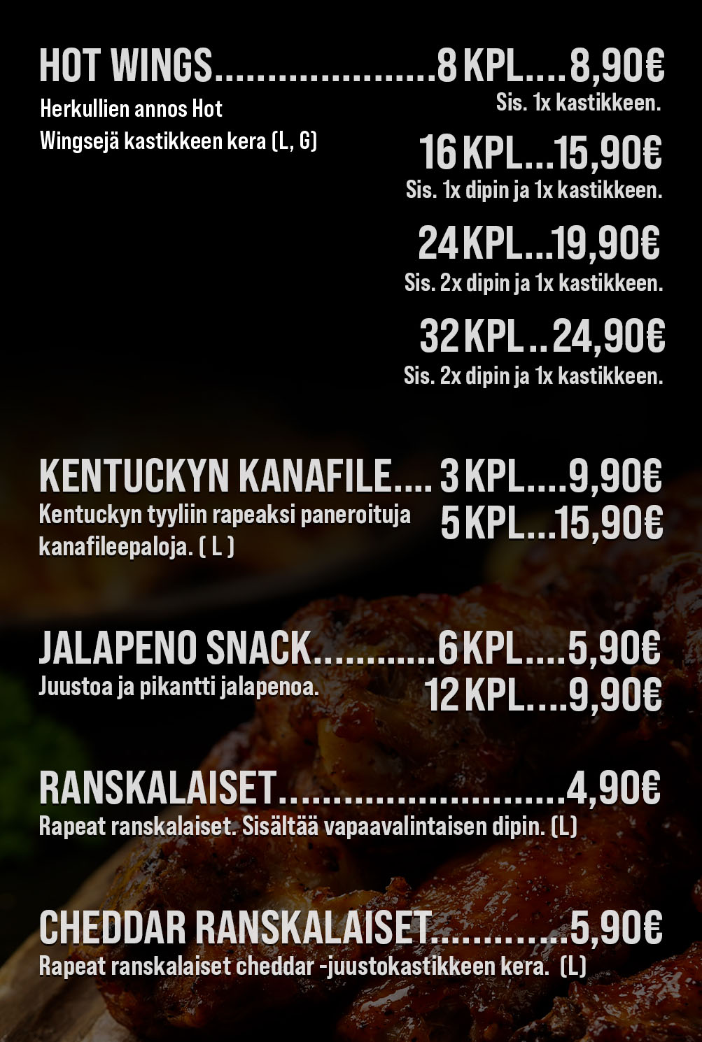 - Vapaavalintainen ruoka listalta Pois lukien Combo; maksimissaan 16 Hot Wings